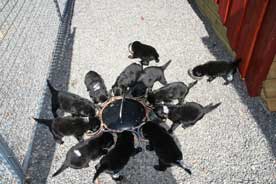 25.04.09. Nasse nøff og vennene hans spiser og griser. Det er jo helt klart sikkert at det er mye mer hos naboen så det må man jo sjekke når man har spist meste parten av sitt eget. De ser ut som små gjørme brytere etter mat. Til Kellies store fryd. Da kan hun vaske vekk masse mat av pelsen etterpå. Det er godt vi har Kjells egenkonstruerte mat bar med plass til 10 valper. Så er det bare 2 skåler ved siden av. Her er gutt hale& Gutt VF.