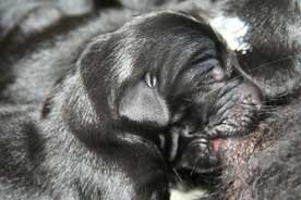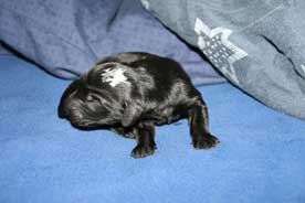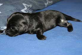08.04.09. Natten har vært stille og rolig. Kellie har jo gjort dette før og er knall flink mamma. Hvis noe er på vei bort fra henne som hun har planer om å vaske, legger hun bare labben over den vill farende og holder den fast til den er vasket slik hun mener den skal. Ganske så artig å se på. Valpene er merket med hvite prikke. Det er vi som har malt dem slik at vi kan følge nøye med hver enkelt for å se at de utvikler seg slik de skal. Her er gutt rygg og gutt høyrebakfot.