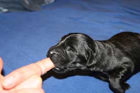 11.04.09. De vokser så man ser det fra time til time og dag til dag. Kellie har masse melk De er veldig kvike alle sammen og det er full krig når melkebilen kommer. Det går kjempe fint med 12 valper og 10 pupper. Heldigvis. :-)Når jeg sitter i kassen så er det plutselig noen som suger seg fast i fingrene mine. Bare tær er ikke lurt å ha oppi der. Alt kan man jo prøve å sjekke om det kommer melk utifra. Her er gutt nakke & jenterumpe.