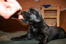 14.05.09. Noen løsere mager fikk vi etter mark kuren i går. Men det ser ut som de har det bra for det. De turner rundt og vil helst gjøre det samme som de som er en uke eldre. De minner meg litt om ungene i 1 klasse borte på skolen som står å beundrere de "store" som går i 2 klasse og så prøver de å gjøre akkurat som de :-) Vi er nok ganske så like selv om vi ser så forskjellige ut. Vi er jo flokk dyr både mennesker og hunder. :-) Her er gutt Vbak full av fante streker & Gutthode en smule trøtt.