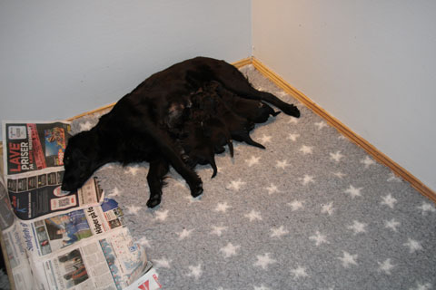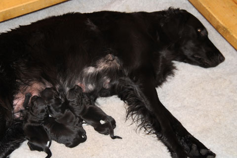 23.10.19. Nå tror jeg fødsel er over. den siste morkaken er kommet og Giga tar livet veldig med ro. Vi følger så klart med videre hvis det skulle ligge noen godt gjemt under ribbene :-)Giga Har tatt seg et bad og fått nytt rent teppe. Hun koser seg med sine skjønne små. Det er vi som har malt de med hvite prikker for å se forskjell på de :-)Her er Giga med sine skjønne små barn.