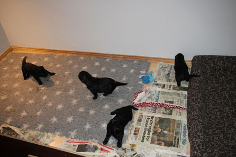 09.11.19. I går åpnet vi opp så de fikk bedre plass. :-) Stor ny verden. De har ikke helt skjønt å gå over helt på avisene enda. De vagger med overkroppen over på avisen å tisser men skjønner ikke helt at bakkroppen fremdeles er på teppet . Men det kommer fort nå i løpet av de neste dagene :-)I dag må jeg jobbe litt mens mamma og pappa kommer å passer hus og små stroll :-) her er Frida og Gutt rumpe