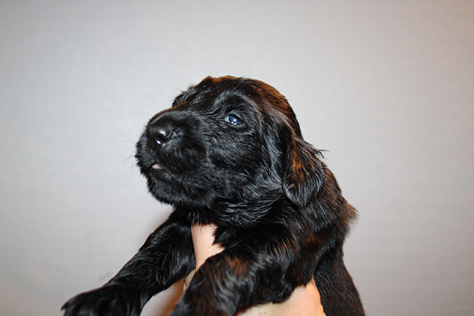 04.10.25. I dag er de skjønne små blitt en uke gamle. Klo klippen ble gjort i går kveld og det gikk fint . Selv om de ikke akkurat sitter rolig når jeg prøver å klippe klørne :-) I dag er det mark kur på menyen. Den må de ha 4 ganger før de skal flytte herifra . Smaker aldri så godt men lurer det i de. Kimmie sin temperatur er mye bedre. Hun har litt mindre melk foreløpig etter infeksjonen så vi hjelper til med flaske hver 3 - 4 time så alle får i seg nok. De koser seg med den ekstra melken å er så fornøyde :-)Nå klokken 03.30 er stormen på full fart her ute. Så turte ikke vente med å sende ut valpedagboken i tilfelle nett og strøm forsvinner etter hvert her .Det uler i huset men hundene tar det helt med ro. Her er Gutt merket nakken og jente merket rygg.