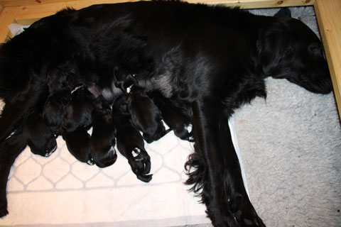 02.04.20. I går var Lykke med på en god lang tur sammen med Norah. Hun synes det er godt med et liv ved siden av mating og rumpevask av sine skjønne små. Trolla stor koser seg med masse melk :-) Her er Gutt merket høyre bakben og gutt merket venstre bakben