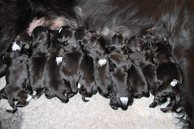 01.11.25 Nå tror vi at alle er kommet ut. Det er store og flotte valper . veier fra 470 gr til 530 gr . Saga er en fantastisk mamma. Ordner å vasker å gir masse fin melk :-) Det er vi som har malt de med hvite prikker . Her er alle ti og fine mamma Saga . Nybadet å med rent teppe. Vi mangler 4 morkaker så det får vi følge med på. Her er alle ti :-)