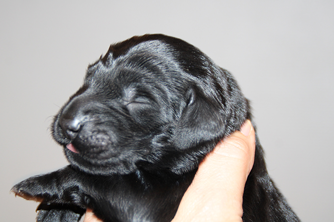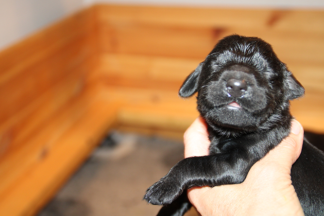 30.09.25. I dag er de skjønne tre døgn gamle. De vokser og trives.Det er mer fart i de når de våkner å skal ha melk. Hvis ikke Kimmie er kjapp til å legge seg så yrer det rundt henne. Noe hun tar med stor ro. Hun vet akkurat hvor hver og en er å legger seg ned der det er ledig plass å aker seg inntil valpene sine. Vi var ute å gikk en litt lenger tur også i går kveld. Kimmie stor kosa seg og var også veldig fornøyd når vi kom inn igjen. :-) Da ble hver å en vasket godt . Her er jente merket rygg og gutt merket halen