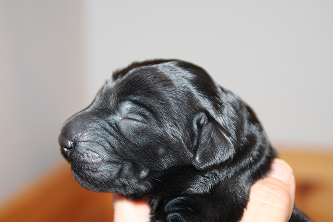 04.10.25. I dag er de skjønne små blitt en uke gamle. Klo klippen ble gjort i går kveld og det gikk fint . Selv om de ikke akkurat sitter rolig når jeg prøver å klippe klørne :-) I dag er det mark kur på menyen. Den må de ha 4 ganger før de skal flytte herifra . Smaker aldri så godt men lurer det i de. Kimmie sin temperatur er mye bedre. Hun har litt mindre melk foreløpig etter infeksjonen så vi hjelper til med flaske hver 3 - 4 time så alle får i seg nok. De koser seg med den ekstra melken å er så fornøyde :-)Nå klokken 03.30 er stormen på full fart her ute. Så turte ikke vente med å sende ut valpedagboken i tilfelle nett og strøm forsvinner etter hvert her .Det uler i huset men hundene tar det helt med ro. Her er Gutt merket nakken og jente merket rygg.