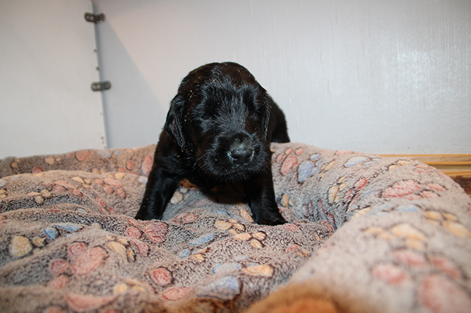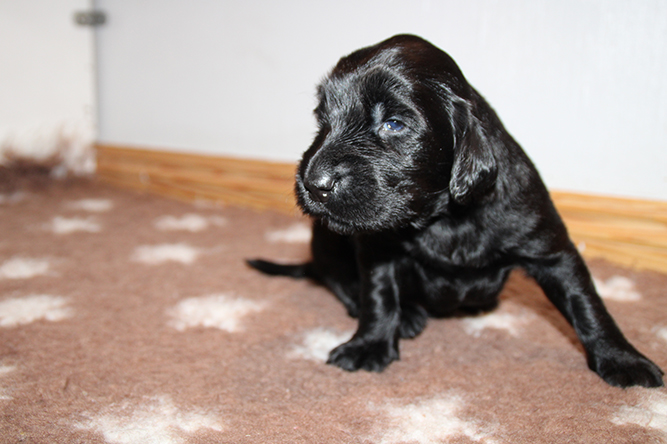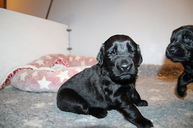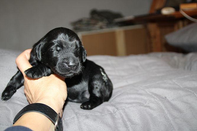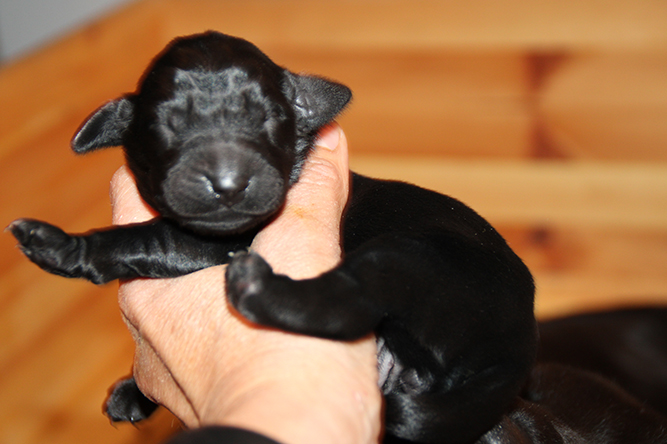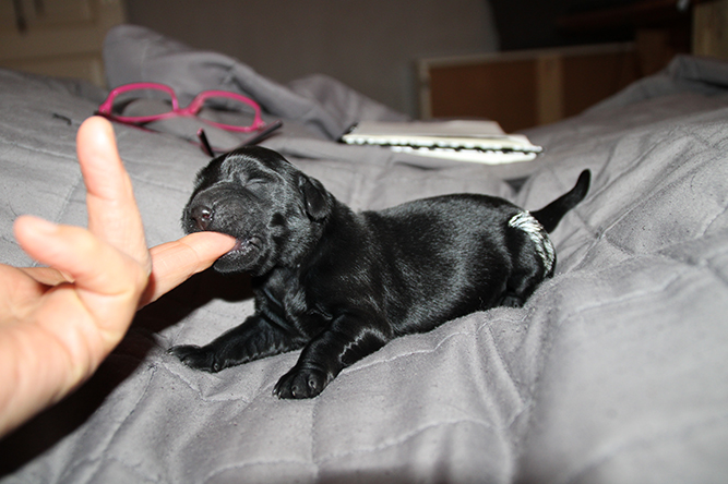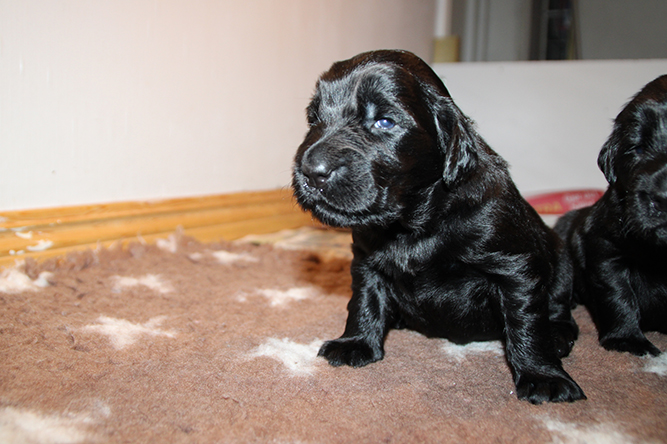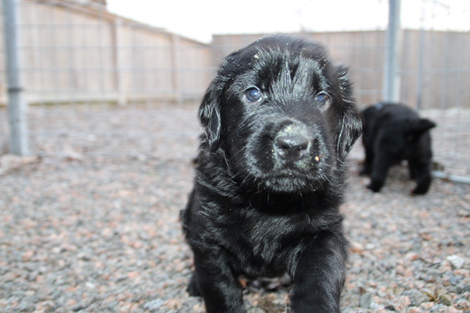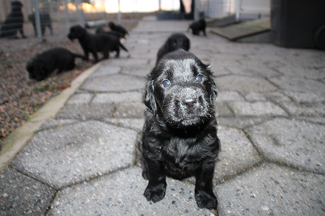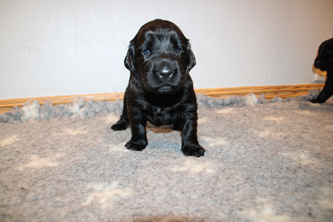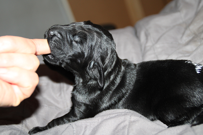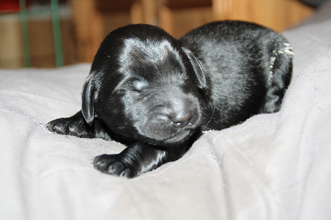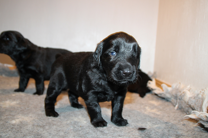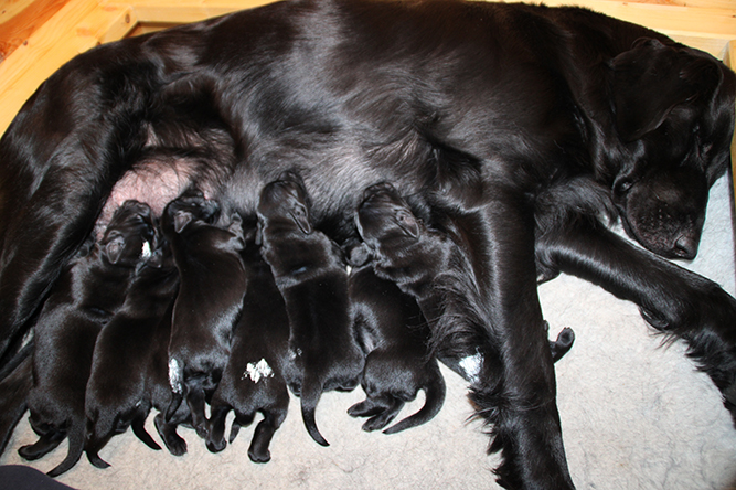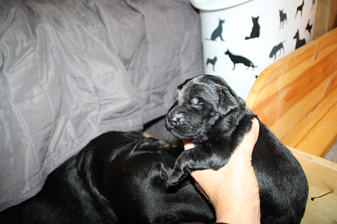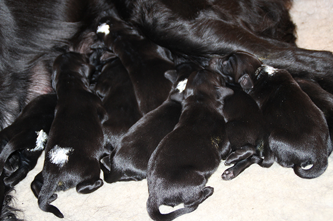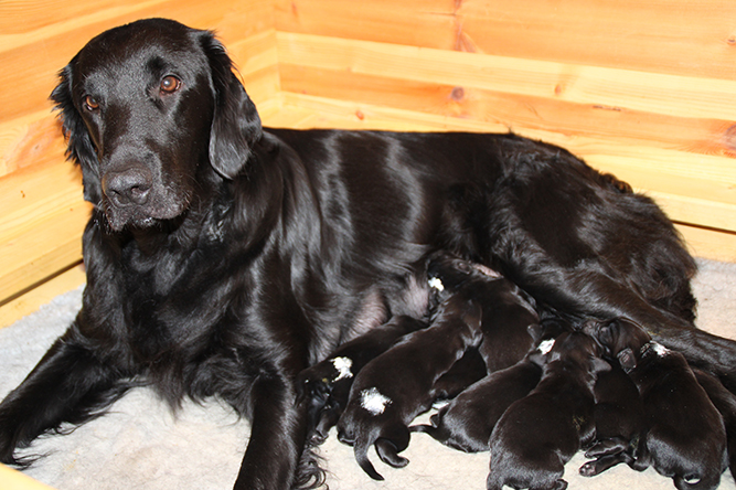 28.10.21. Det er fart i de små sorte gullende når de våkner nå. De åler seg fort gjennom valpekassen på leting etter puppen og melken :-) Ikke alltid like lett å få lagt seg Mille står noen ganger å ser litt fortvilet ned på haugen med skjønneste som åler rundt å funderer tydelig på hvor skal jeg legge meg fort ned så jeg ikke ligger på noen . :-) Hun er kjempe flink :-) Her er jente merket på rumpen og gutt merket på rumpen