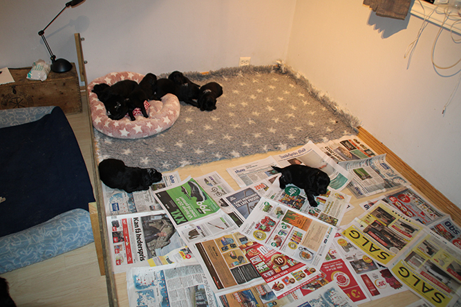 05.11.21.I dag må vi åpne opp. Nå er det for trangt å de trenger mer plass. Vi ser også at de trekker ut mot kanten av valpekassen for å tisse . Så da får vi begynne å øve å komme seg over på aviser for å gjøre dette . Her er jente rumpe og gutt rumpe