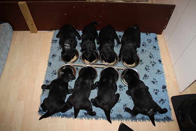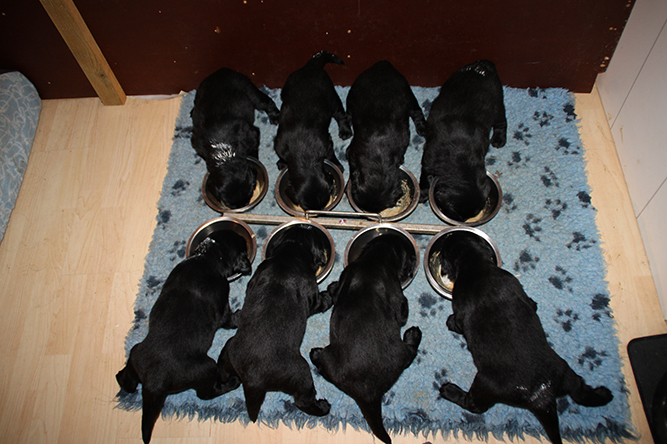 11.11.21. Trolla elsker grøten sin . Nå har vi begynt å blande inn litt mosa Eukanuba . Alt skjer gradevis og de elsker maten sin. I dag øker vi til 4 små måltider. Mille har gått ned til å gi melk 4 ganger i døgnet. så tilsammen er det 8 måltider de spiser nå :-) Her er jente venstre bak og jente høyre bak.