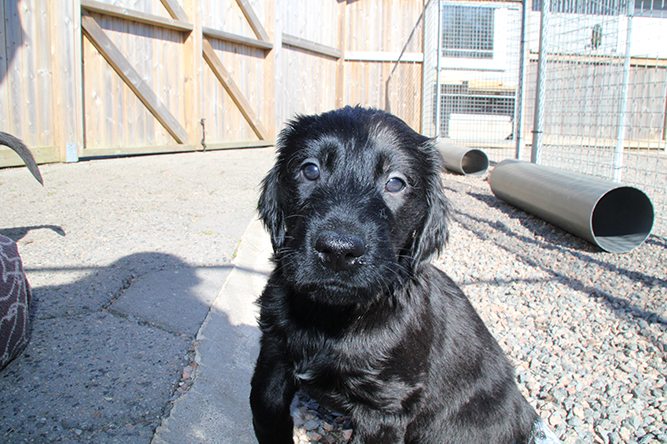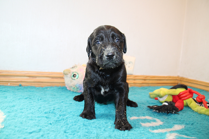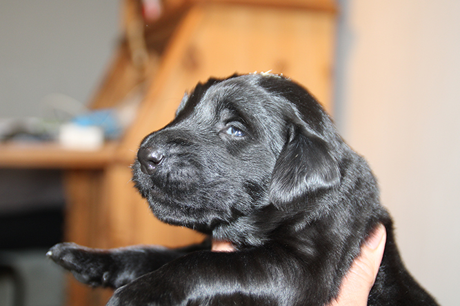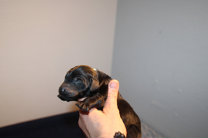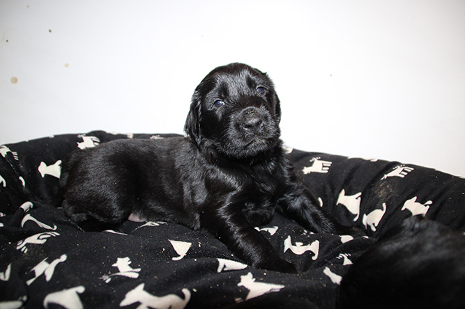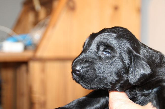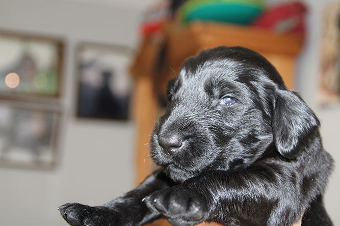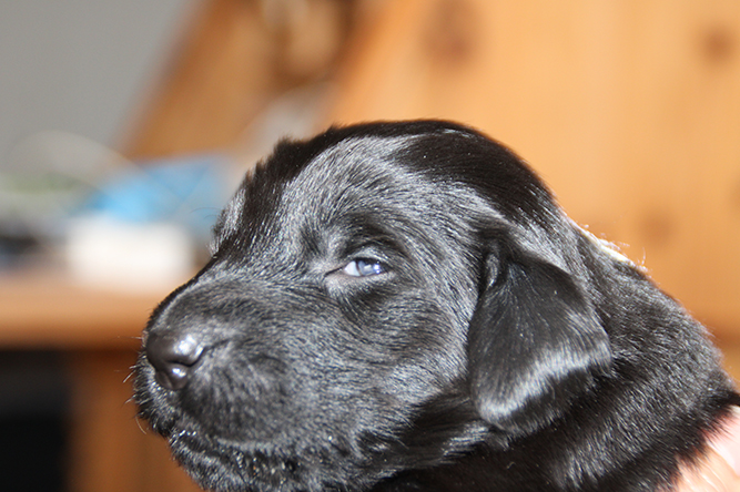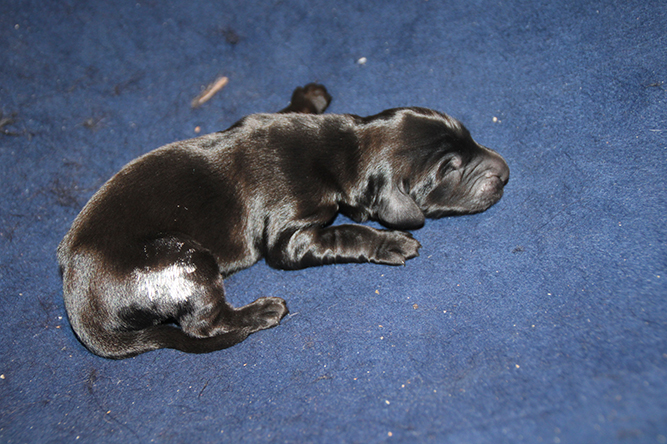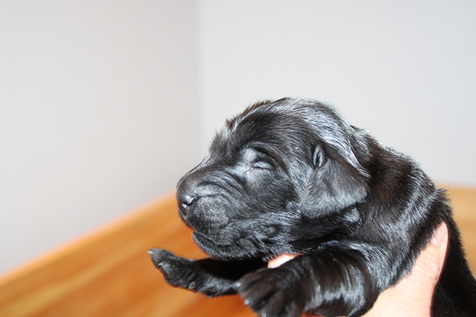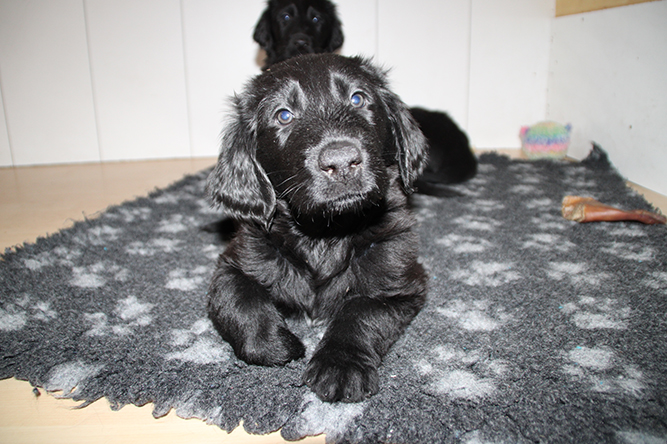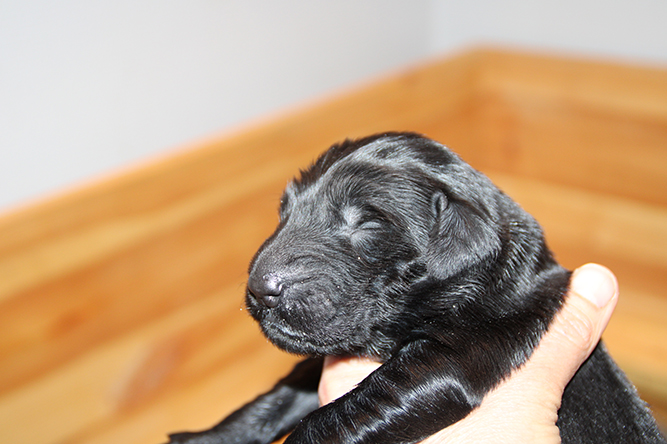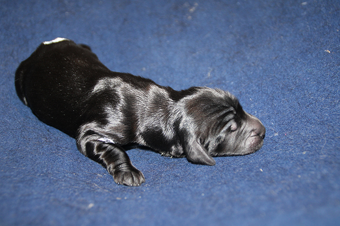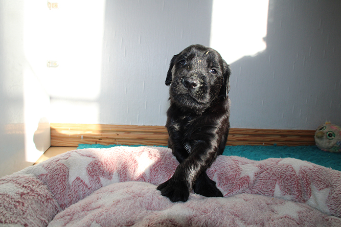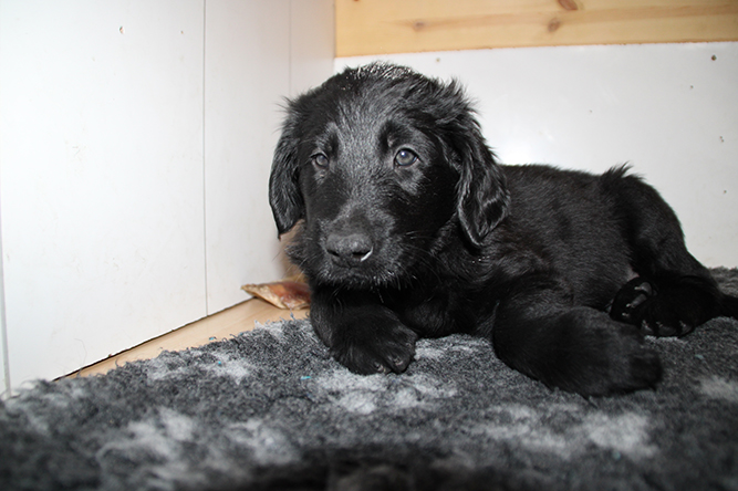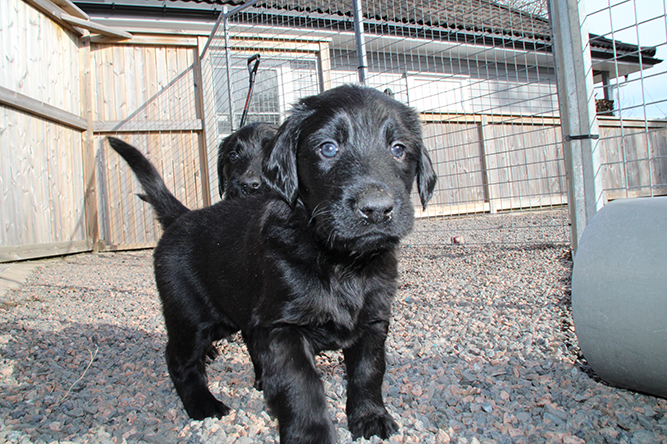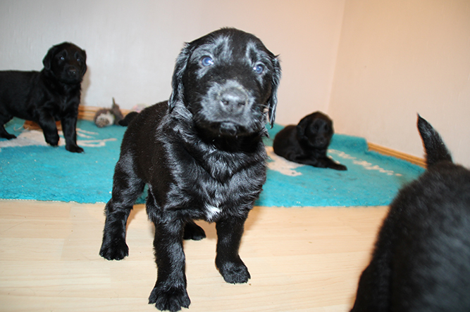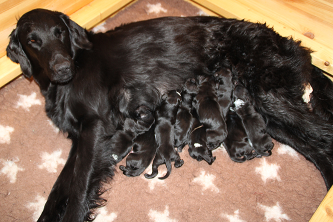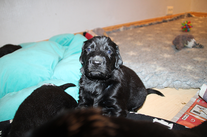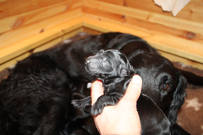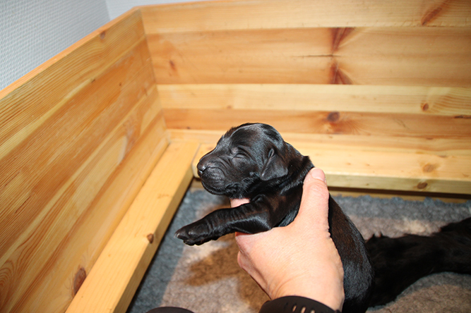 06.04.22. I dag er de skjønne små sorte gullene blitt 4 uker gamle Klo klipp er gjort nå kl 5 å vekten er sjekket ,alt er ok å de er så flinke. Oda fikk forhøyet temperatur i går men heldigvis fikk vi den under kontroll igjen i løpet av kvelden. Hun fikk en jurbetennelse i den ene puppen men er nå i god form igjen heldigvis. Ting skjer fort skal jeg love. Tror hun kan ha fått trekk av den sterke vinden selv om hun går med ull over puppene ute når vi lufter henne. Valpene passer hun godt på å ordner som vanlig her :-) Flinke Oda mamman det :-)Her er jente rumpe og Koda/ gutt rumpe
