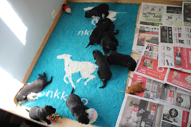 15.04.22. Deilig å være begge to hjemme å kose seg med de små og de store. I går var alle en tur på bordet å de er så fine :-) Lille Ecco på 12 uker var på besøk i valperommet for første gang i går å det gikk kjempe fint. Vi var også ute å gikk flere turer i den stoooore verden . Dvs Ute i hagen der de andre hundene er . Det var spennende det :-) Her er jente rumpe og Koda/ gutt rumpe