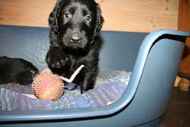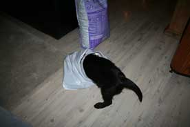 29.01.10. I dag reiser Nemie med fly til Bergen. Blir spennende å høre om hun underholder alle de andre på turen. :-) Max reiste også i dag morges til Sandnes. Nå i kveld reiser Tyra og i morgen tidlig reiser Sheeba. Hun flytter inn i bur på soverommet vårt nå i natt. Så da får hun litt trening på å sove alene. Nikita var en tur tilbake her for å sjekke om hun hadde fått urinsveis infeksjon ,men heldigvis så var det ingen utslag på hverken bakterier eller blod. Hun spiste litt lite nå i dag og tisset litt ofte. Med kulden så er man jo var å sjekker heller en gang for mye en en gang for lite. :-)Men heldigvis var det ingen ting. Max står som dere ser på hodet i posen hvor alt Katrine har kjøpt til han er . Han sjekker om det var de tingene han ønsket seg :-) I dag er det siste dagen jeg skriver i valpedagboken til P gjengen. Så nå er det bare å glede seg til første valpe treffet. Her er Max som undersøker ,så er det Tyra & Sheeba.