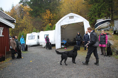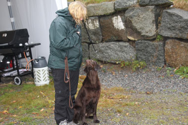 Etter denne økten var både hunder og førere veldig slitne. Så da var det lunsj med grilling og Inger Johannes nydelig sjokolade kake. Tusen masse takk for den :-)Det trengte vi i regnværet. Vi brukte teltet som campingvogna pleier å stå i til å grille og kose oss i. det var deilig å komme litt ut av det våte været. Etter lunsj gikk vi igjennom en del enkle ting med helse stell og pleie av hunden som vi lett kan fikse selv.