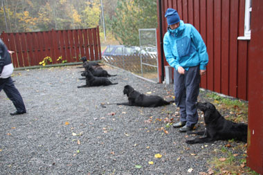 Så var det endelig dagen for valpetreff nr 2 for Æ & Ø barna våres. Jopp,Fiona,Balder,Rollo,Runner & Jambo tok seg turen hit for å dele denne søndagen med oss. Utrolig morsomt å se hvor herlige de er sammen. Vi startet dagen med lett regnvær som ikke gav seg i det hele tatt. Men vi fikk gjort det vi skulle for det. Vi startet med feltsøk som alle fikk prøve seg på. dette fikset alle sammen kjempe fint. bare litt jobb med avleveringene så blir dette helt supert. :-) Alle bærer med glede en dummie og synes dette er kjempe morsomt.